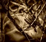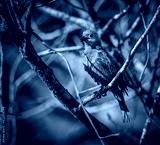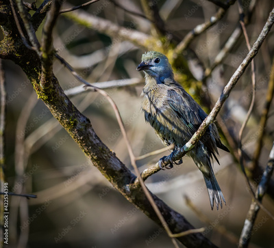 A wet juvenile blue grey tananger, hides in the bushes to dry
