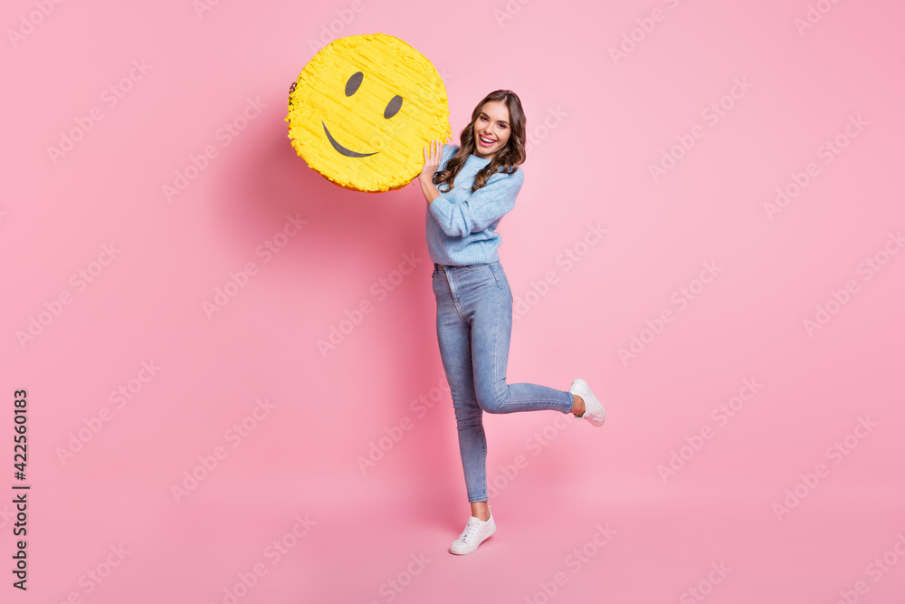 Full length body size view of attractive cheerful girl holding smiley having fun isolated over pink pastel color background
