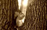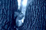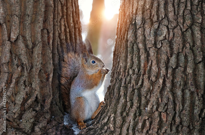Cute curious squirrel on pine tree trunk. Squirrel eating nuts, natural background. Eurasian red squirrel (Sciurus vulgaris) close up