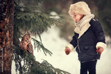 Little girl is meeting an owl in Russian forest in winter. Image with selective focus and toning