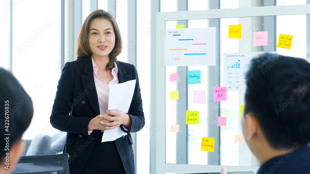 Businesswoman presenting business plan information to team at office meeting, Asian leader woman explaning business chart for teamwork, business people, success in business concept
