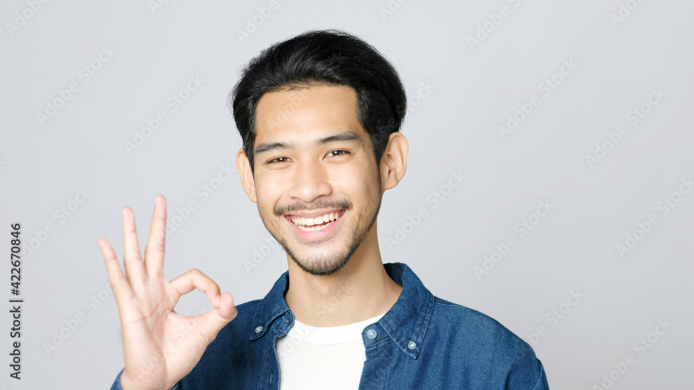 Close up of young asian man showing ok hand sign and smiling while standing over isolated yellow background, Happy asia male showing ok hand, Positive people gesture