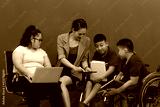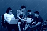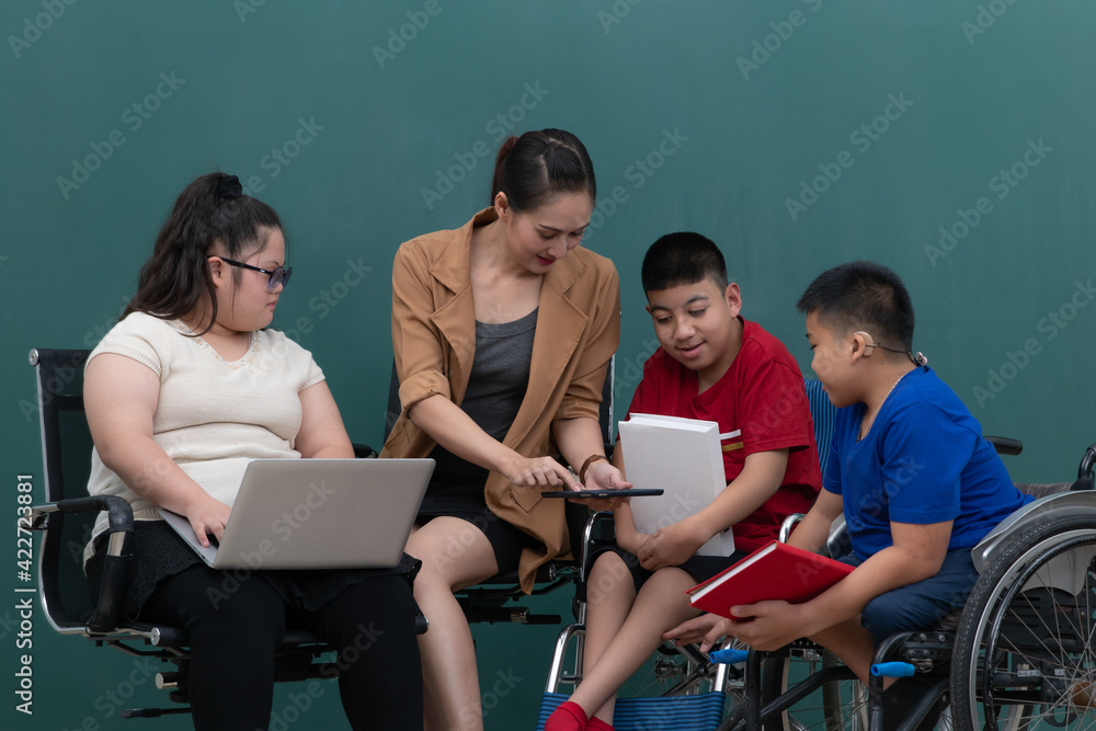 Portrait group of special kids classroom, disable and down syndrome boys, girl and teacher taking photo together with happiness and intimate pose