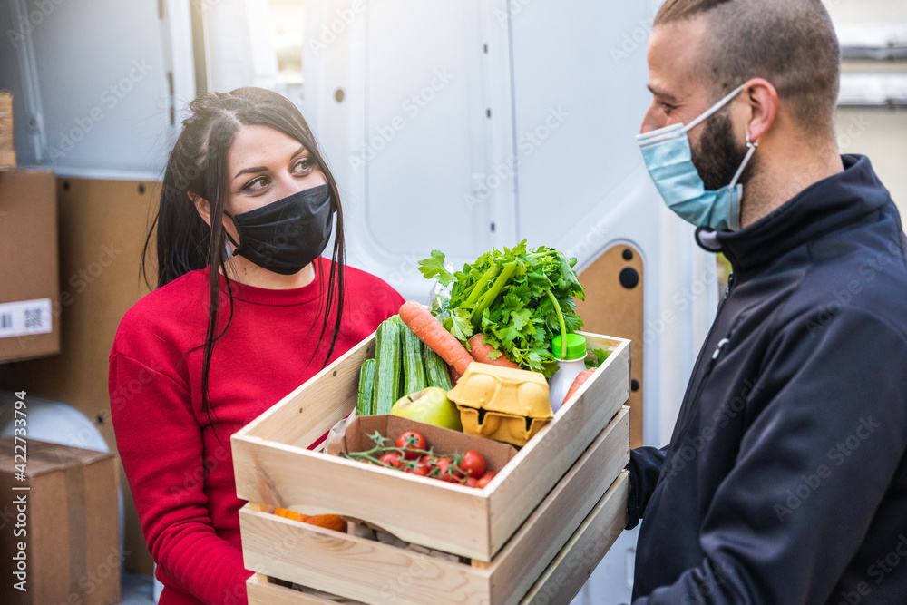 Young woman courier delivers to customer man a basket of fruit and vegetables bought online at supermarket wearing face mask and gloves during the global Coronavirus Covid-19 pandemic