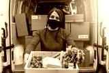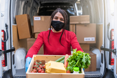 Portrait of a young female courier holding a basket of food about to be delivered to customer bought at supermarket - Millennials wearing face mask and gloves during global pandemic from Coronavirus