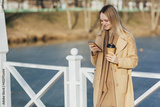 Blonde stylish girl is using smartphone outdoor, enjoying coffee cup while standing near lake in park.