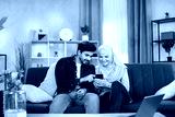 Happy smiling muslim couple in love, sitting on comfortable blue sofa and choosing favourite photos on smartphone, while spending leisure time at home. Happy Arabian family.