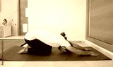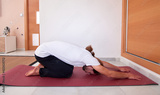 A side view of a Spanish bearded young male in sportswear practicing yoga on the yoga mat at home