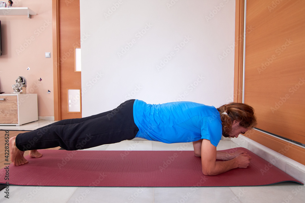 Side view of a Spanish bearded young male in sportswear doing the plank on the yoga mat at home