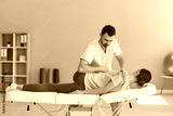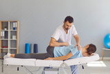 Confident man doctor chiropractor or osteopath fixing womans back and legs joints