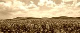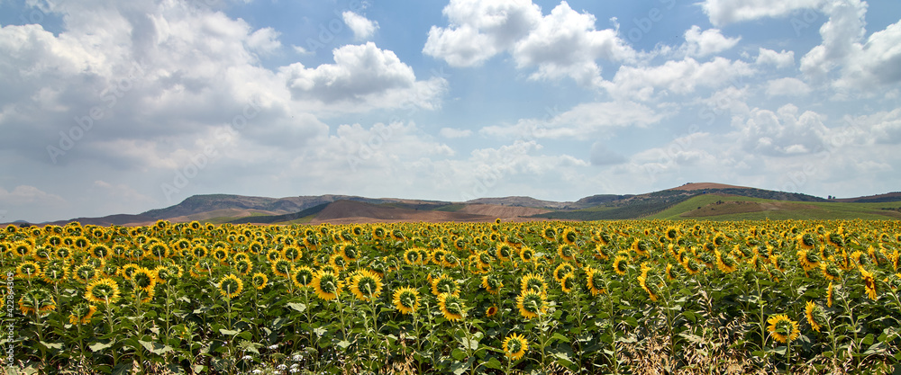 A panoramic shot of a sunflower field with a mountain background under a cloudy sky