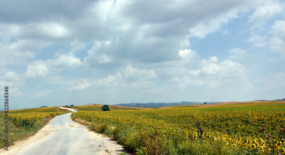 A beautiful view of an unpaved road near a sunflower field under a cloudy sky
