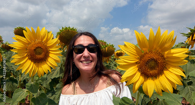 A cheerful beautiful Turkish woman in sunglasses posing on a sunflower field