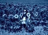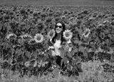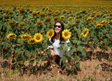 A cheerful beautiful Turkish woman in sunglasses posing on a sunflower field