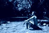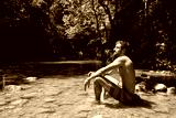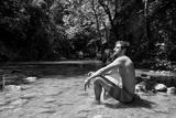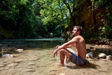 A handsome Caucasian man sitting on a rock in a river under sunlight