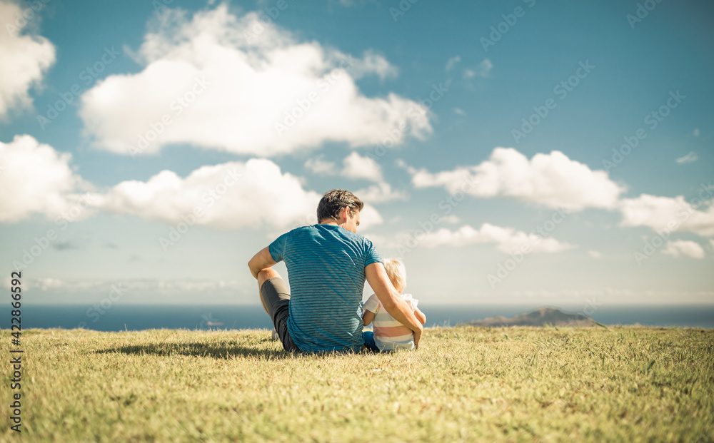 Father and son sitting together in grass field. Family lifestyle, parenting, and fathers day concept.