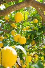 Fresh organic lemons on tree in the orchard, harvesting, picking