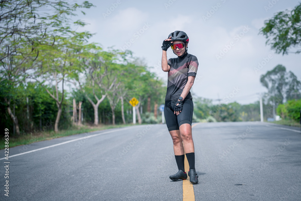 Beautiful biker wearing sport wear sunglass and helmet ride cyclist with her mountain bike in race adventure outdoor game competition on road, extreme healthy sport concept.