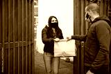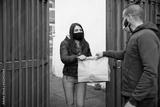 Delivery man delivers a take away bag to customer containing the fast food bought online wearing a face mask during global pandemic from Coronavirus Covid-19 - Staff consigns the package to the buyer