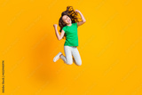 Full size photo of happy screaming excited crazy little girl jumping in victory success isolated on yellow color background