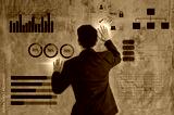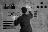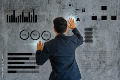 businessman turned his back on a suit a graph and chart on a gray wall as a background. Business planning Concept strategy.