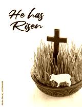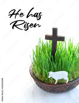 He Has Risen. Easter table decoration. cross, dove, sheep, wheat sprouts in pot. Resurrection garden, DIY decor composition. symbol of Easter, Resurrection.