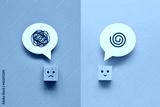 Two cubes with a pattern of confusion of one and a clear line at the other. Confusion from one person's thoughts and clarity in the head of another