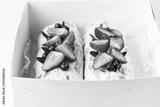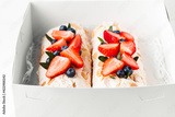 Meringue roll with almond flakes in the white gift box on the white background. Pavlova summer dessert with soft cream decorated with strawberries and blueberries.
