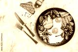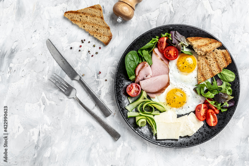 fried egg ham tomatoes for healthy breakfast. English breakfast toast, egg, bacon and vegetables. banner, menu recipe place for text, top view