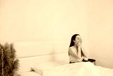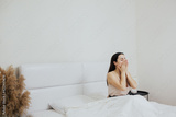 Sleepy girl sitting in bed at early morning and yawns. She covers her mouth with her hands.