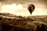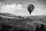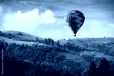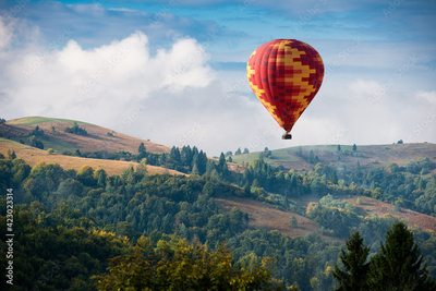 Hot air balloon flying over mountains