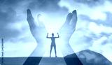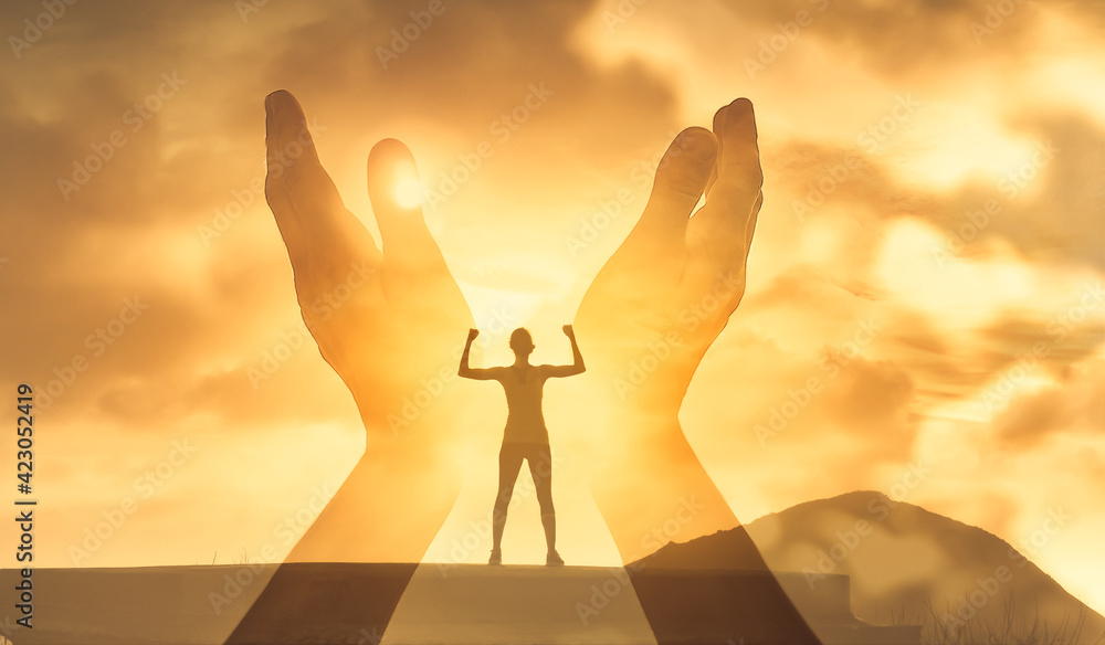 Finding strength and power through religion, and worship. Strong woman with worshiping hand up to the sky.