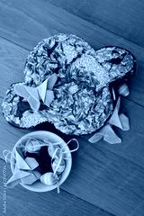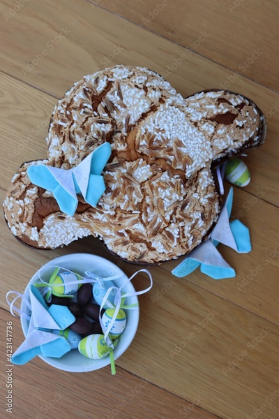 Sweet Easter cake called Colomba Pasquale on a wooden table with fabric butterflies decorations and chocolate eggs. Italian traditional pastry