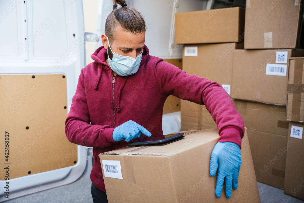 Young man shipper with van during the delivery round in the global pandemic from Covid-19 Coronavirus wearing face mask while checking with tablet the address of customer to consign the order online