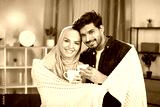 Romantic relationship. Cute Arabian Muslim couple standing together under warm blanket in the living room and drinking coffee together.