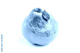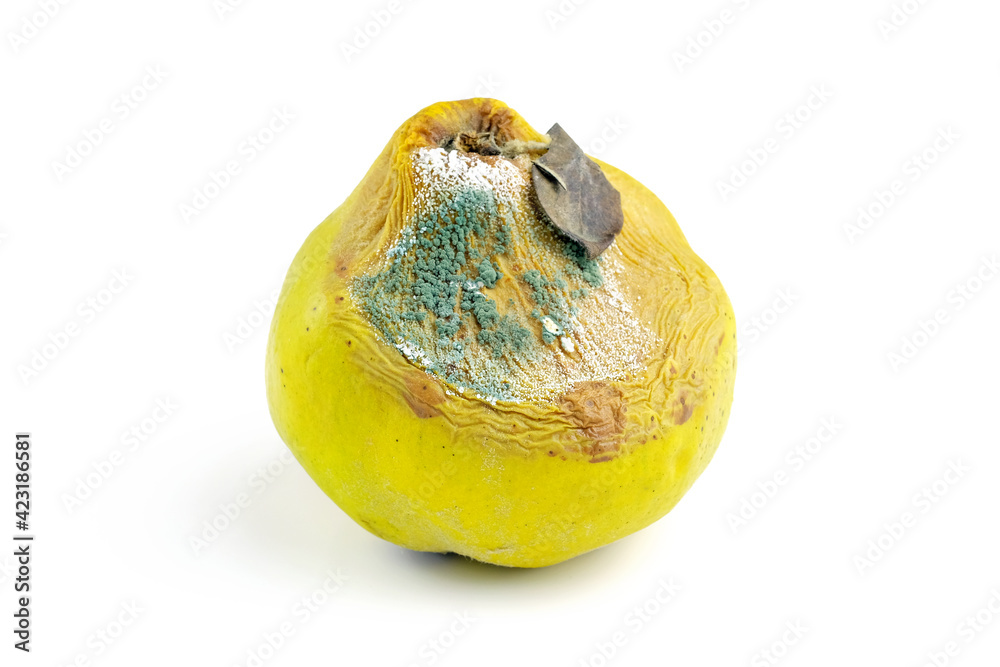 Yellow rotten quince on a white background. Spoiled fruit with mold close-up. Blue and white mold on ripe quince.
