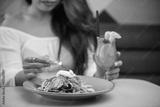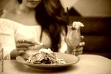 Close up of young brunette woman drinking cocktail and eating nachos with melted cheese and spicy salsa sauce in cafe or restaurant