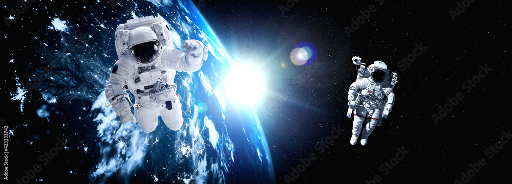 Astronaut spaceman do spacewalk while working for space station in outer space . Astronaut wear full spacesuit for space operation . Elements of this image furnished by NASA space astronaut photos.