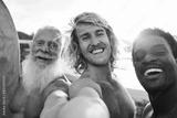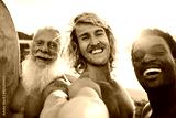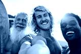 Multi generational surfer friends having fun on the beach after surf session - Multiracial friendship and extreme sport lifestyle concept - Main focus on center guy face
