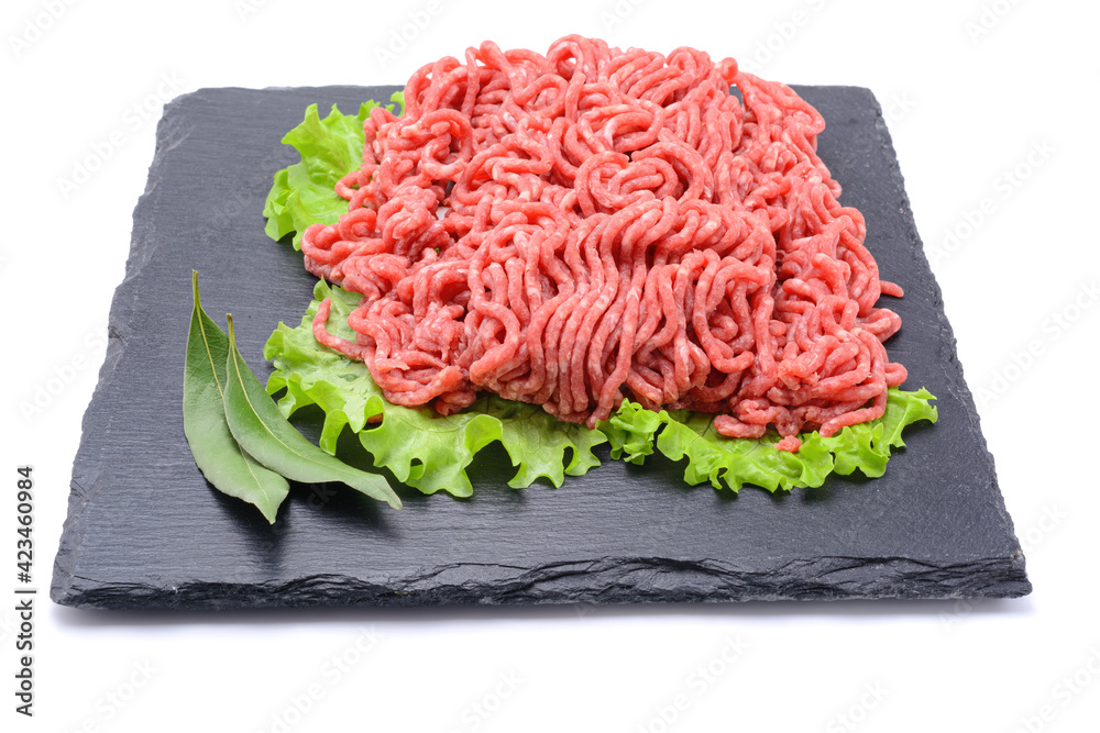 Fresh minced pork and beef and spices on a slate stone.Isolated on a white background, selective focus. horizontal view.