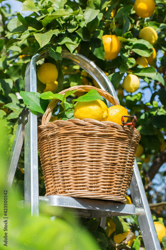 Basket with fresh organic lemons in the orchard, harvesting, picking