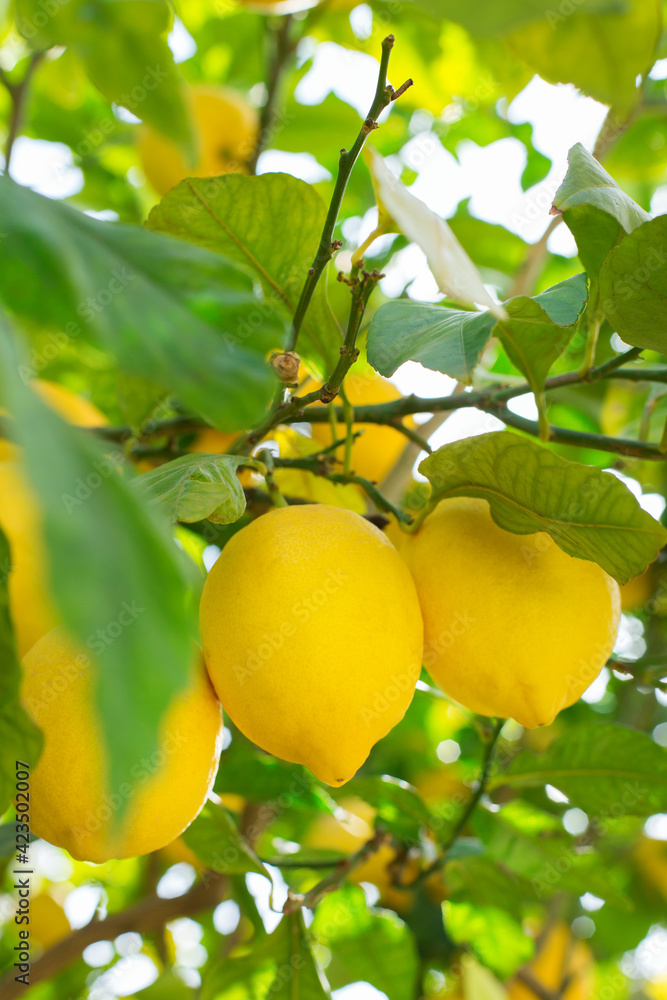 Fresh organic lemons on tree in the orchard, harvesting, picking
