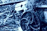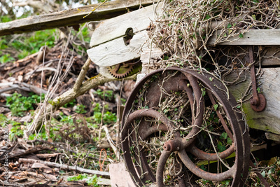 Derelict farm machinery seen heavily weathered and rusted. The ornate metal wheel shows its unusual spoke structure.