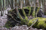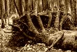 Large, uprooted dead tree located in a wilderness area. The large roots on the base give a haunting impression to the scene.