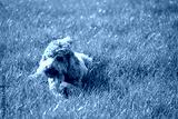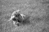 Young miniature poodle dog seen laying in lush grass while chewing at a stick she has found.