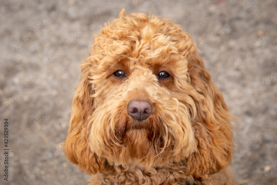 Young apricot coloured, Miniature Poodle dog looking at her owner while out for her daily exercise. The hypoallergenic, non shedding hair makes this a popular breed for allergy sufferers.