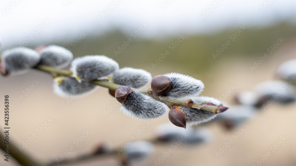Pussy willow branch on blurred bokeh background. Sunny spring light. Empty spring easter background. Close-up.