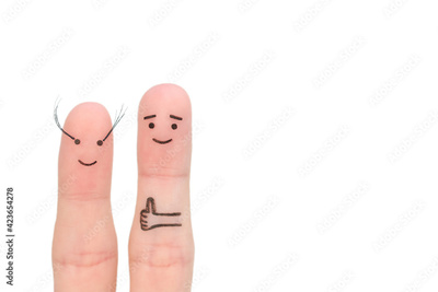 Fingers art of Happy couple. Man likes women's long eyelashes isolated on white.