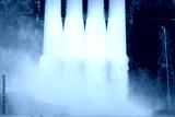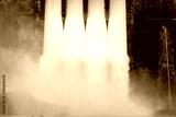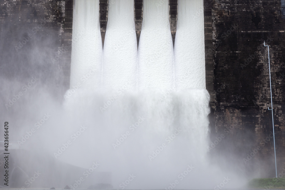 Water flowing over floodgates of a dam at Khun Dan Prakan Chon