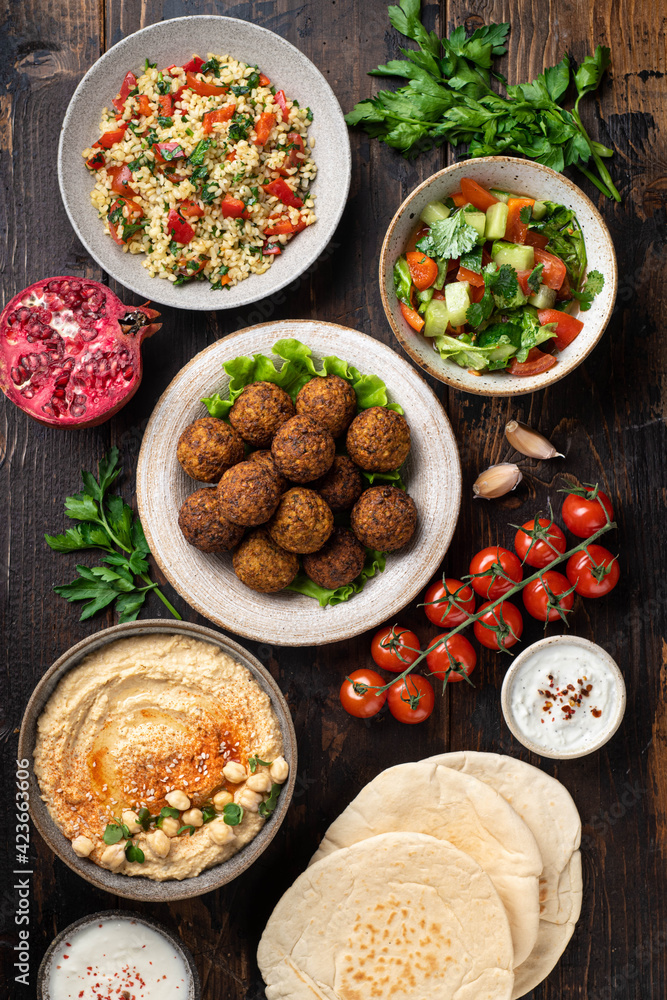 Middle eastern or arabic cuisines, falafel, hummus, tabouleh, pita and vegetables on wooden background, view from above
